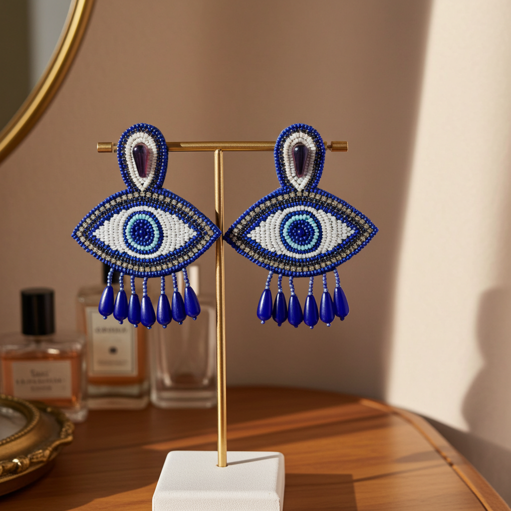 Channel protection and positivity with our Evil Eye Dark Blue Beaded Earrings, designed to bring both meaning and elegance to your everyday look. Handcrafted with rich dark blue beads and centered with the powerful evil eye charm, these earrings are more than just an accessory — they’re a statement of style and spiritual strength. Whether worn for cultural significance, fashion, or a mix of both, they pair effortlessly with casual outfits, ethnic wear, or even boho-inspired looks. Lightweight and comfortable, they offer a unique mix of tradition and trend, making them a thoughtful gift or a personal talisman of good vibes.
