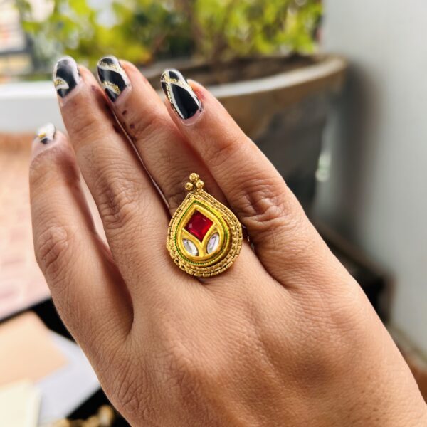 Traditional kundan Cocktail ring meets modern elegance with this golden teardrop party wear ring, designed for festive glam.