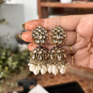These stunning party wear earrings combine the timeless charm of kundan with elegant pearl drops. The green stones paired with detailed jhumki design make them perfect for weddings, parties, and festive celebrations. Crafted with premium finish, these jhumkis are lightweight, comfortable, and designed to add a royal touch to your ethnic look.