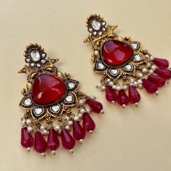 Make a bold and stylish statement with these stunning partywear earrings featuring a rich red kundan centerpiece, surrounded by delicate pearl detailing and striking red bead drops.
