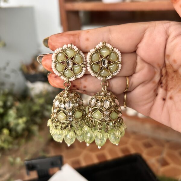 Elevate your festive and wedding looks with these stunning PartyWear Jhumka Earrings, available in three enchanting shades — lemon yellow, refreshing mint green, and soft lavender. Crafted with a floral stud top and traditional jhumka drop, each piece is adorned with kundan stones, pearls, and matching dangling beads for a luxurious finish.