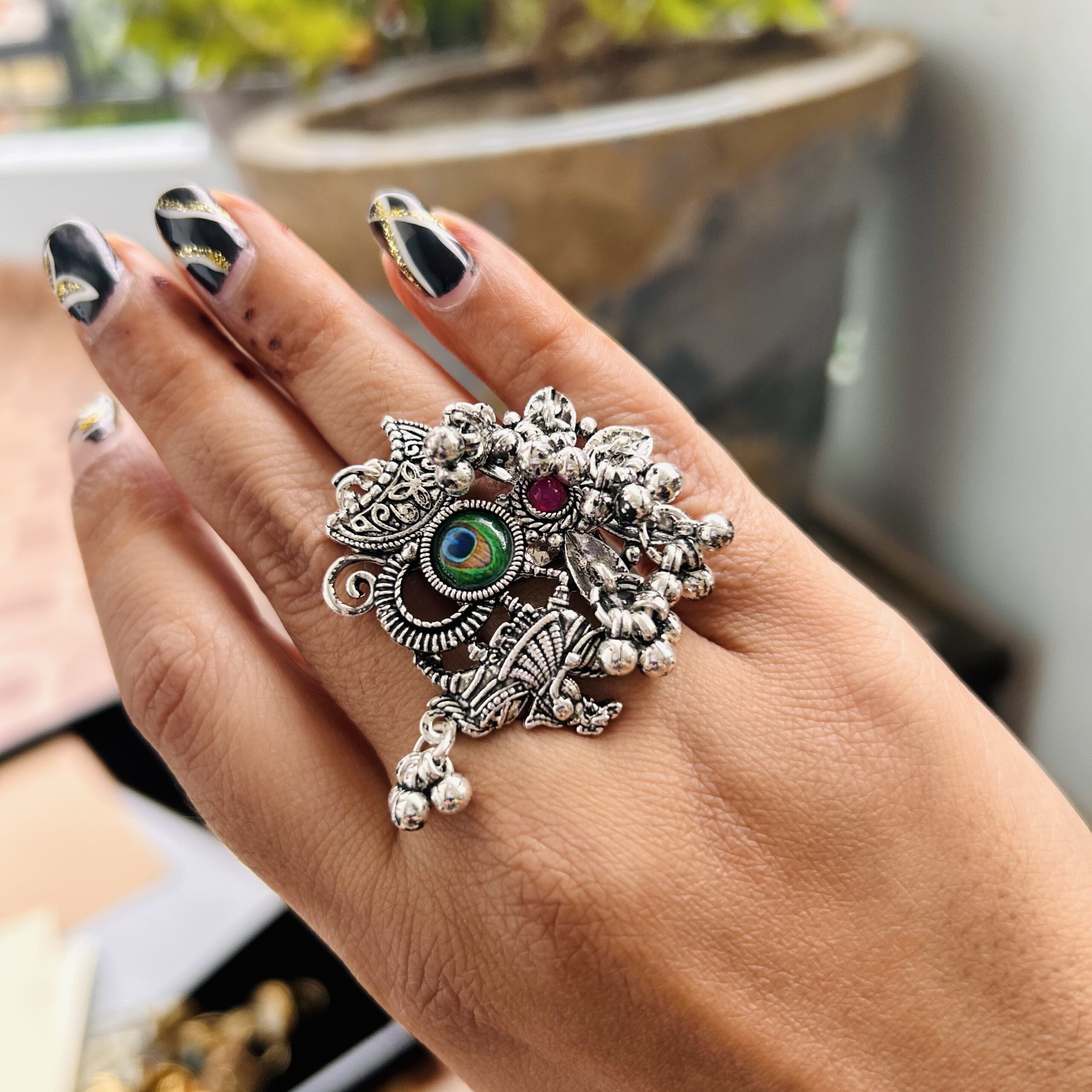 Make a bold statement with this handcrafted silver peacock design cocktail ring, perfect for parties and festive wear.